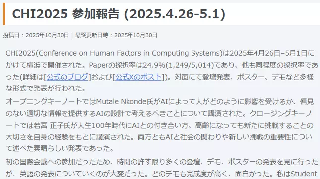 大塚君のCHI2025参加報告がHI学会ウェブページに掲載されました。